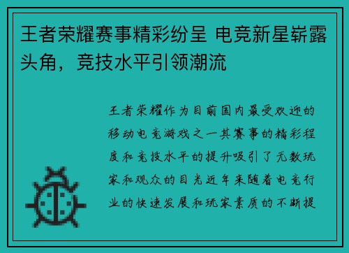 随着电子竞技行业的飞速发展,王者荣耀这一游戏也逐渐成为了竞技场上的焦点。电竞赛事热潮汹涌而来,吸引了...