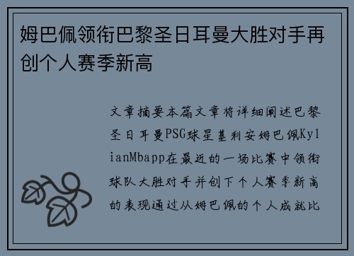 文章摘要:本篇文章将详细阐述巴黎圣日耳曼(PSG)球星基利安·姆巴佩(Kylian Mbappé)在最近的一场比赛中领衔球队大胜对手并创下个人赛季新高的表现。通过从姆巴佩的个人成就、比赛中的关键时刻、...
