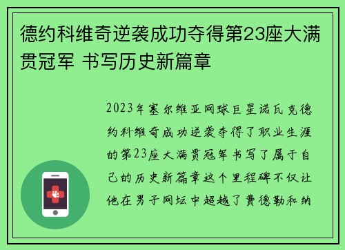 2023年,塞尔维亚网球巨星诺瓦克·德约科维奇成功逆袭,夺得了职业生涯的第23座大满贯冠军,书写了属于自己的历史新篇章。这个里程碑不仅让他在男子网坛中超越了费德勒和纳达尔,成为史上最多大满贯男单冠军得...