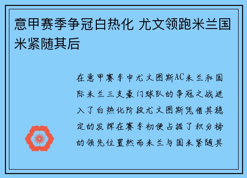 在意甲赛季中,尤文图斯、AC米兰和国际米兰三支豪门球队的争冠之战进入了白热化阶段。尤文图斯凭借其稳定的发挥,在赛季初便占据了积分榜的领先位置,然而,米兰与国米紧随其后,形成了强有力的竞争态势。本文将从...