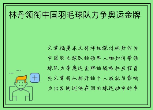 文章摘要:本文将详细探讨林丹作为中国羽毛球队的领军人物,如何带领球队力争奥运金牌的战略和历程。首先,文章将从林丹的个人成就与影响力出发,阐述他在羽毛球运动中的卓越表现以及如何成为中国羽毛球队的精神象征...