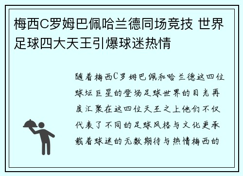 随着梅西、C罗、姆巴佩和哈兰德这四位球坛巨星的登场,足球世界的目光再度汇聚在这四位天王之上。他们不仅代表了不同的足球风格与文化,更承载着球迷的无数期待与热情。梅西的精准与创造力,C罗的力量与技术,姆巴...
