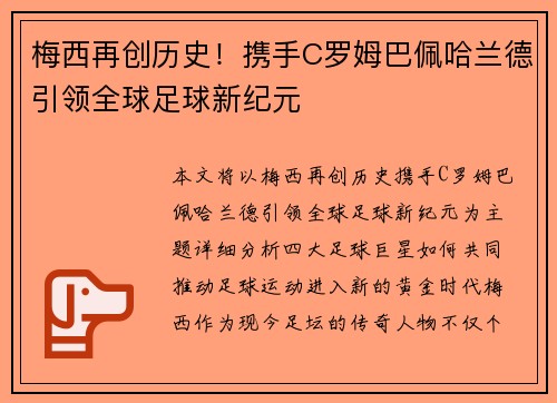 本文将以“梅西再创历史!携手C罗、姆巴佩、哈兰德引领全球足球新纪元”为主题,详细分析四大足球巨星如何共同推动足球运动进入新的黄金时代。梅西作为现今足坛的传奇人物,不仅个人成就斐然,而且通过与C罗、姆巴...