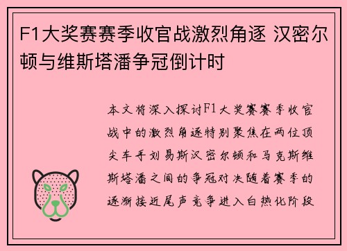 本文将深入探讨F1大奖赛赛季收官战中的激烈角逐,特别聚焦在两位顶尖车手——刘易斯·汉密尔顿和马克斯·维斯塔潘之间的争冠对决。随着赛季的逐渐接近尾声,竞争进入白热化阶段。尤其在最后几场比赛中,汉密尔顿和...