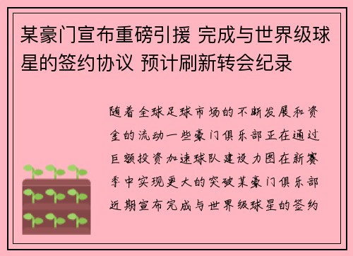 随着全球足球市场的不断发展和资金的流动,一些豪门俱乐部正在通过巨额投资加速球队建设,力图在新赛季中实现更大的突破。某豪门俱乐部近期宣布完成与世界级球星的签约协议,预计这笔交易将刷新现有转会纪录,成为转...