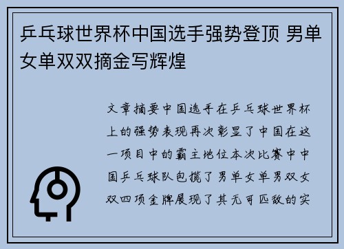 文章摘要:中国选手在乒乓球世界杯上的强势表现,再次彰显了中国在这一项目中的霸主地位。本次比赛中,中国乒乓球队包揽了男单、女单、男双、女双四项金牌,展现了其无可匹敌的实力。无论是在技术层面还是心理素质上...