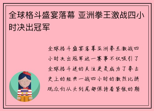 全球格斗盛宴落幕,亚洲拳王激战四小时决出冠军,这一赛事不仅吸引了全球格斗迷的关注,更是成为了拳击史上的经典一战。四小时的激烈比拼,观众们从头到尾都保持着紧张的期待,而赛场上的每一次拳击、每一场角逐,都...