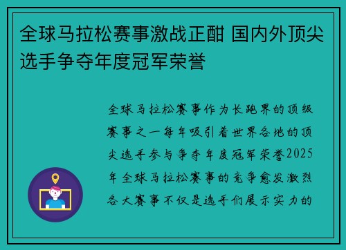 全球马拉松赛事作为长跑界的顶级赛事之一,每年吸引着世界各地的顶尖选手参与,争夺年度冠军荣誉。2025年,全球马拉松赛事的竞争愈发激烈,各大赛事不仅是选手们展示实力的平台,也是挑战自我的舞台。无论是传统...