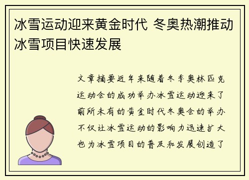 文章摘要:近年来,随着冬季奥林匹克运动会的成功举办,冰雪运动迎来了前所未有的黄金时代。冬奥会的举办不仅让冰雪运动的影响力迅速扩大,也为冰雪项目的普及和发展创造了有利条件。本文将从四个方面详细探讨冬奥热...