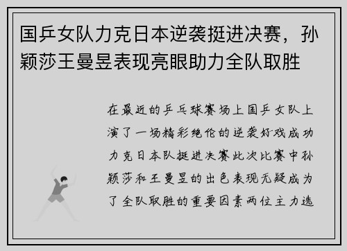 在最近的乒乓球赛场上,国乒女队上演了一场精彩绝伦的逆袭好戏,成功力克日本队,挺进决赛。此次比赛中,孙颖莎和王曼昱的出色表现无疑成为了全队取胜的重要因素。两位主力选手的稳定发挥和关键时刻的突破,使得国乒...