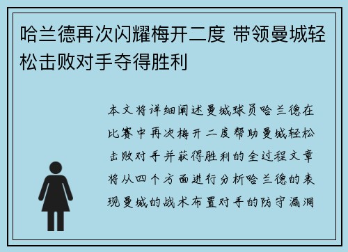 本文将详细阐述曼城球员哈兰德在比赛中再次梅开二度,帮助曼城轻松击败对手并获得胜利的全过程。文章将从四个方面进行分析:哈兰德的表现、曼城的战术布置、对手的防守漏洞以及比赛的最终结果与意义。每一部分将通过...