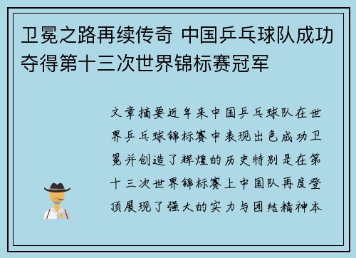 文章摘要:近年来,中国乒乓球队在世界乒乓球锦标赛中表现出色,成功卫冕并创造了辉煌的历史。特别是在第十三次世界锦标赛上,中国队再度登顶,展现了强大的实力与团结精神。本文将从四个方面对中国乒乓球队成功卫冕...