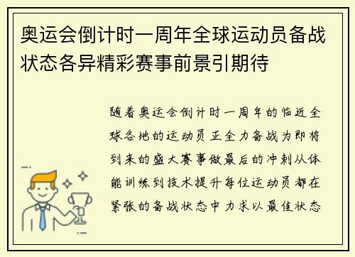 随着奥运会倒计时一周年的临近,全球各地的运动员正全力备战,为即将到来的盛大赛事做最后的冲刺。从体能训练到技术提升,每位运动员都在紧张的备战状态中,力求以最佳状态迎接挑战。不同国家、不同项目的运动员们在...