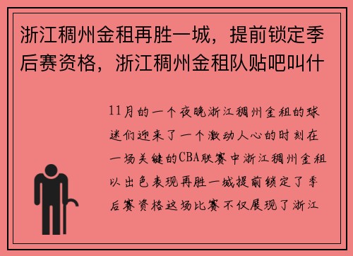 11月的一个夜晚,浙江稠州金租的球迷们迎来了一个激动人心的时刻。在一场关键的CBA联赛中,浙江稠州金租以出色表现再胜一城,提前锁定了季后赛资格。这场比赛不仅展现了浙江稠州金租的强大实力,也再次证明了这...