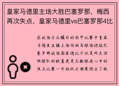 在这场万众瞩目的西甲比赛中,皇家马德里坐镇主场伯纳乌球场,迎战巴塞罗那。这场“国家德比”不仅是两支顶级球队的较量,更是无数球迷心中的焦点。比赛一开始,双方都展现出了极高的竞技状态,但皇家马德里凭借更高...
