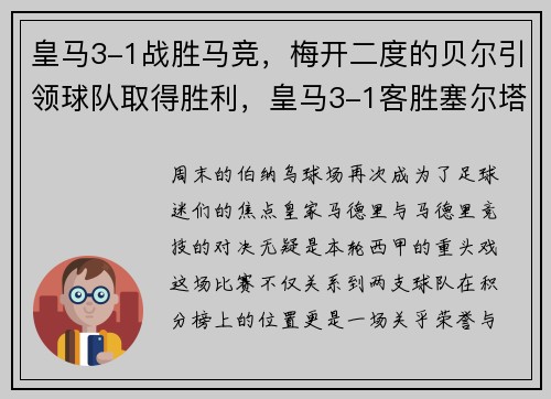 周末的伯纳乌球场再次成为了足球迷们的焦点,皇家马德里与马德里竞技的对决无疑是本轮西甲的重头戏。这场比赛不仅关系到两支球队在积分榜上的位置,更是一场关乎荣誉与士气的较量。而最终,皇马凭借贝尔的出色表现,...