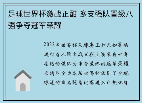 2022年世界杯足球赛正如火如荼地进行着,八强之战正在上演,来自世界各地的强队为争夺最终的冠军荣耀而拼尽全力。本届世界杯吸引了全球球迷的目光,随着比赛进入白热化阶段,实力强劲的球队纷纷脱颖而出,逐步进...