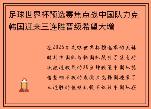 在2026年足球世界杯预选赛的关键时刻,中国队与韩国队展开了焦点对决。经过激烈的90分钟较量,中国队凭借坚韧不拔的表现力克韩国,迎来了三连胜的佳绩。此役不仅让中国队在晋级之路上迈出了至关重要的一步,也...