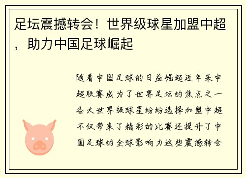 随着中国足球的日益崛起,近年来,中超联赛成为了世界足坛的焦点之一。各大世界级球星纷纷选择加盟中超,不仅带来了精彩的比赛,还提升了中国足球的全球影响力。这些震撼转会不仅是球员个人职业生涯的一大步,也是中...