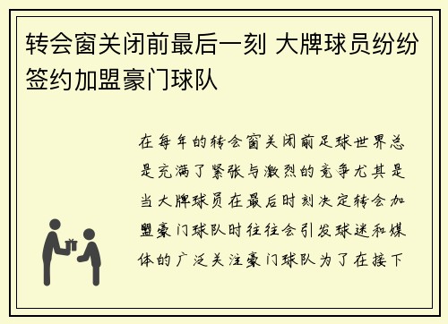 在每年的转会窗关闭前,足球世界总是充满了紧张与激烈的竞争。尤其是当大牌球员在最后时刻决定转会加盟豪门球队时,往往会引发球迷和媒体的广泛关注。豪门球队为了在接下来的赛季中保持竞争力,纷纷加大投入,争抢世...