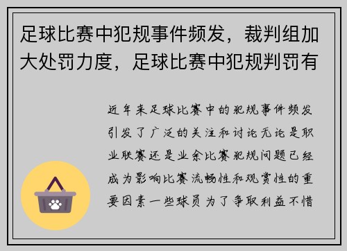 近年来,足球比赛中的犯规事件频发,引发了广泛的关注和讨论。无论是职业联赛还是业余比赛,犯规问题已经成为影响比赛流畅性和观赏性的重要因素。一些球员为了争取利益,不惜采取危险动作,甚至故意犯规,这不仅损害...