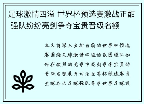 本文将深入分析当前的世界杯预选赛,围绕足球激情四溢的氛围,强队如何在激烈的竞争中亮剑、争夺宝贵的晋级名额展开讨论。世界杯预选赛是全球各大足球强队争夺世界足球顶级赛事席位的重要战场,比赛紧张激烈,每场比...