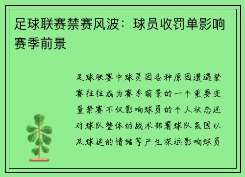 足球联赛中,球员因各种原因遭遇禁赛,往往成为赛季前景的一个重要变量。禁赛不仅影响球员的个人状态,还对球队整体的战术部署、球队氛围以及球迷的情绪等产生深远影响。球员因禁赛而缺席的比赛,不仅是对球队阵容的...