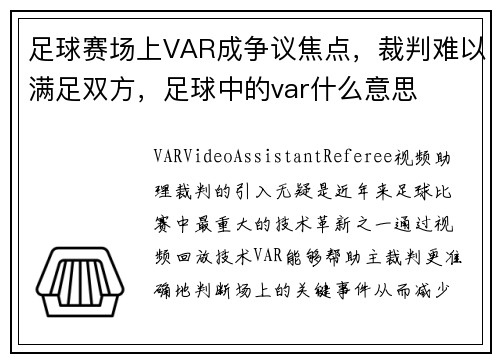 VAR(VideoAssistantReferee,视频助理裁判)的引入,无疑是近年来足球比赛中最重大的技术革新之一。通过视频回放技术,VAR能够帮助主裁判更准确地判断场上的关键事件,从而减少人为错误...